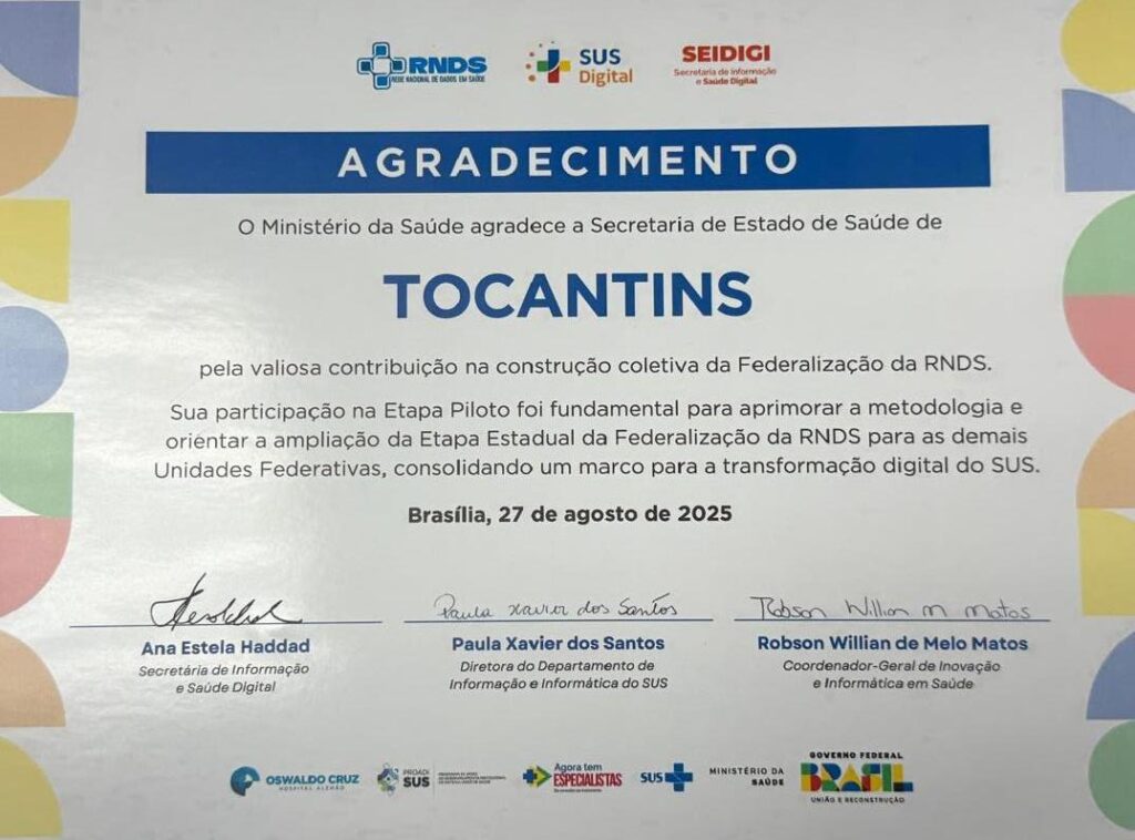 Segundo o MS, “a participação da Secretaria de Estado da Saúde do Tocantins, na Etapa Piloto da Federalização RNDS foi fundamental para aprimorar a metodologia e orientar a ampliação da Etapa Estadual da Federalização da RNDS para as demais Unidades Federativas brasileiras, consolidando um marco para a transformação digital do Sistema Único de Saúde (SUS)”.